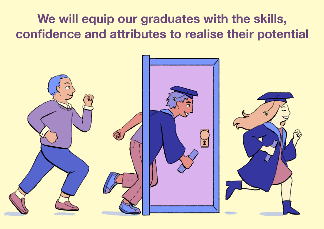 Supported by strong partnership-working with our students and Students’ Union, we will equip our graduates with the skills, confidence and attributes to realise their potential, to succeed in their workplace and careers and to be active global citizens. The University aims to: • Develop confident, resilient and socially aware learners • Provide an environment for the development of professionally relevant, research informed and innovative programmes • Support staff in the development and enhancement of their role in providing excellence in higher education